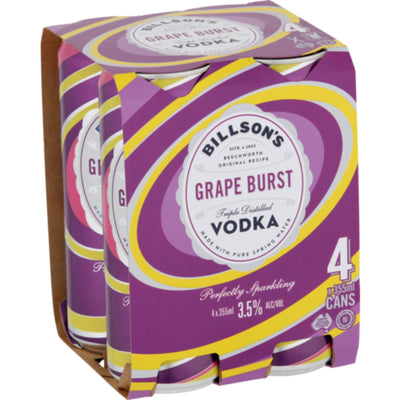 Billson’s Grape Burst Vodka is a vibrant and juicy premixed drink crafted in Beechworth, Victoria, using triple distilled vodka and pure alpine spring water. It bursts with bold grape flavours, supported by a touch of dark berry depth, delivering a smooth, fruit-forward sip and a crisp, refreshing finish. With its vivid purple hue and lively, tangy profile, this 3.5% ABV ready-to-drink tipple is reminiscent of late-harvest grapes and is perfect for those seeking a flavourful, easy-drinking option for any occasion.
