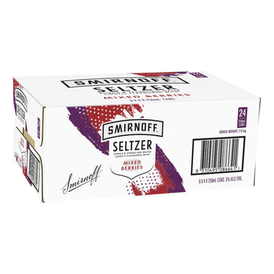 Smirnoff Seltzer Berry 250ml is a refreshing hard seltzer combining the clean, crisp taste of sparkling water with a vibrant mixed berry medley, including blackberry, blueberry, and raspberry notes. It offers a dry and clear flavour profile with a rounded mouthfeel, delivering a refreshing finish that is light and easy to enjoy. With 5% alcohol by volume, zero sugar, and only 71 calories per can, it is a modern, health-conscious choice for those seeking a flavourful and low-calorie alcoholic option.
